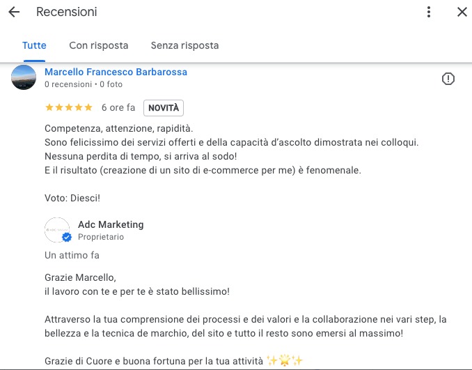 In pochi passaggi, siamo riusciti a trasformare un’idea in un’attività concreta e ben posizionata online. Il cliente, soddisfatto del risultato, ci ha lasciato queste recensioni: